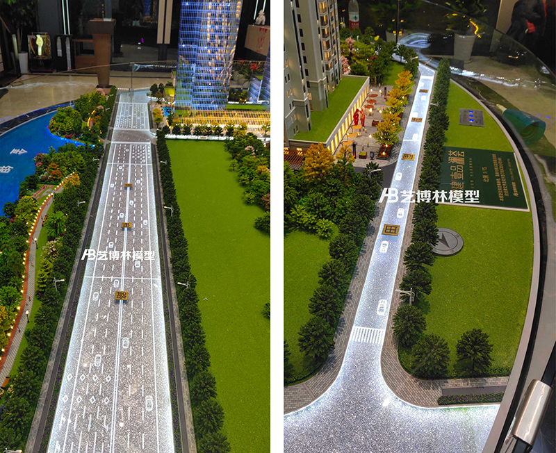 馬路的設計則運用透明有機玻璃制作,通過(guò)激光加工立體雕刻出道路指示線(xiàn)及小車(chē)形狀。道路下邊暗藏LED燈光,通過(guò)道路線(xiàn)和小車(chē)線(xiàn)條泛光形成道路效果,展現現代繁華感覺(jué)。